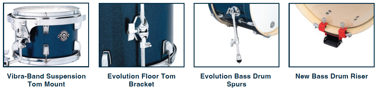 Även golvpukans fäste har uppdaterats till en ny “Evolution”-design, vilket förbättrar stabiliteten och gör setet mer robust vid transport och livebruk. Detsamma gäller bastrummans ben, som nu erbjuder bättre stabilibet och pålitlighet på scen.