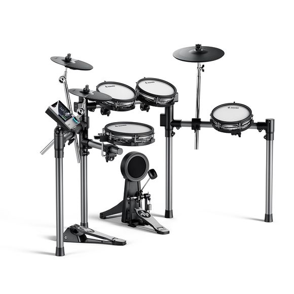 Trumsetet är utrustat med meshskinn på virveltrumma, pukor och bastrumma, vilket ger en rad fördelar för trummisar. Meshskinn är kända för sin ljudreduktion, vilket gör dem idealiska för övning hemma eller i situationer där ljudnivån behöver hållas nere. De reagerar också mer naturligt och ger en realistisk känsla som liknar akustiska trummor, vilket gör det lättare att överföra färdigheter mellan elektroniska och akustiska trumset.