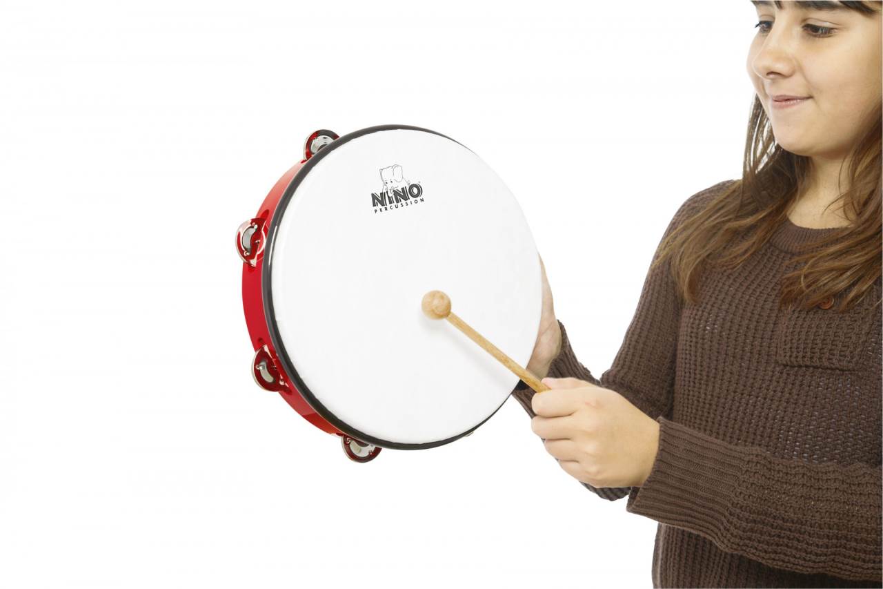 NINO24R. Tamburin med skinn samt klubba ABS 10'', R - Red.Tillverkad av slitstark ABS-plast och med syntetiskt skinn borgar för god hållbarhet i må