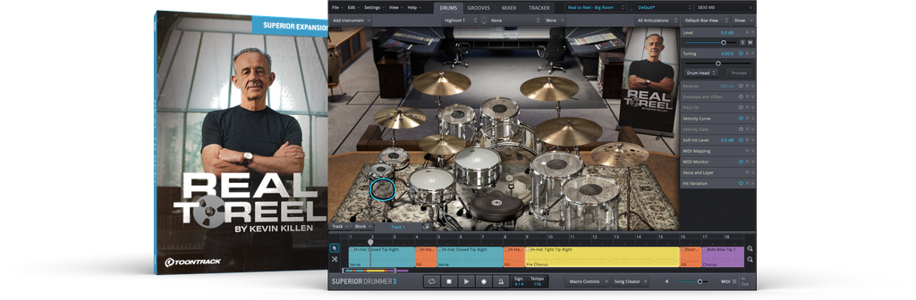 Real to Reel comes complete with 440 MIDI grooves and fills inspired by Kevin Killen’s productions, along with 44 mix-ready presets for every kit and room setup. Ideal for both quick results and deep sound exploration.