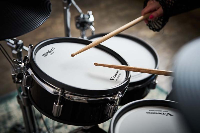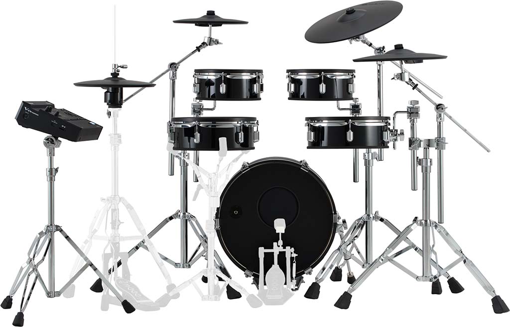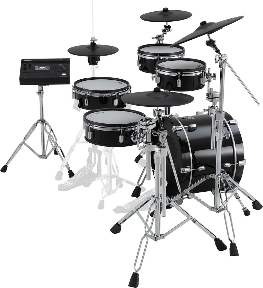 - Five-piece V-Drums Acoustic Design kit with shallow wood shells and a full-size kick.