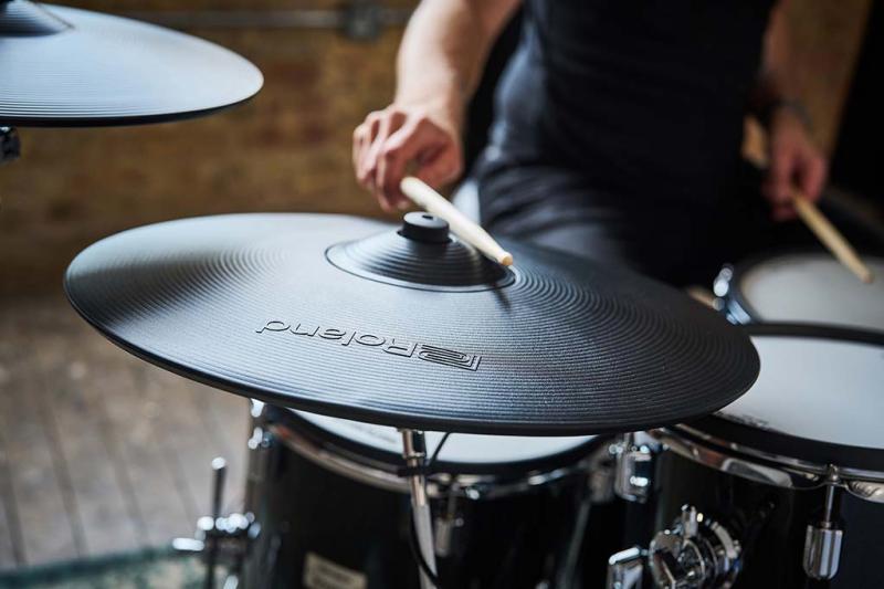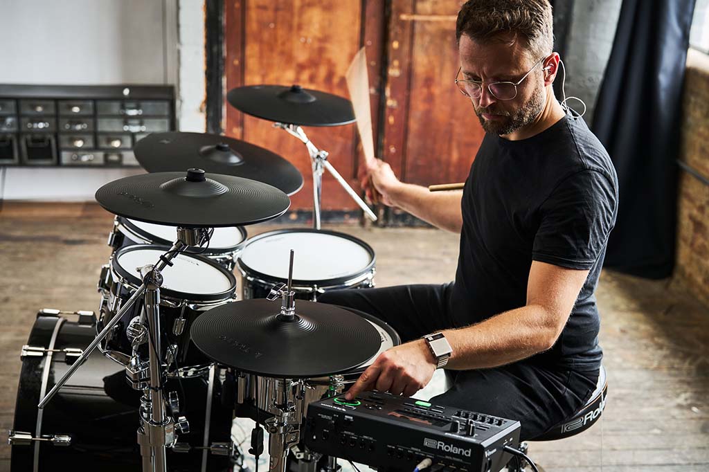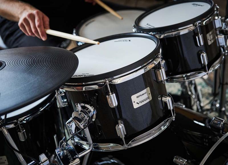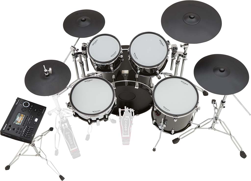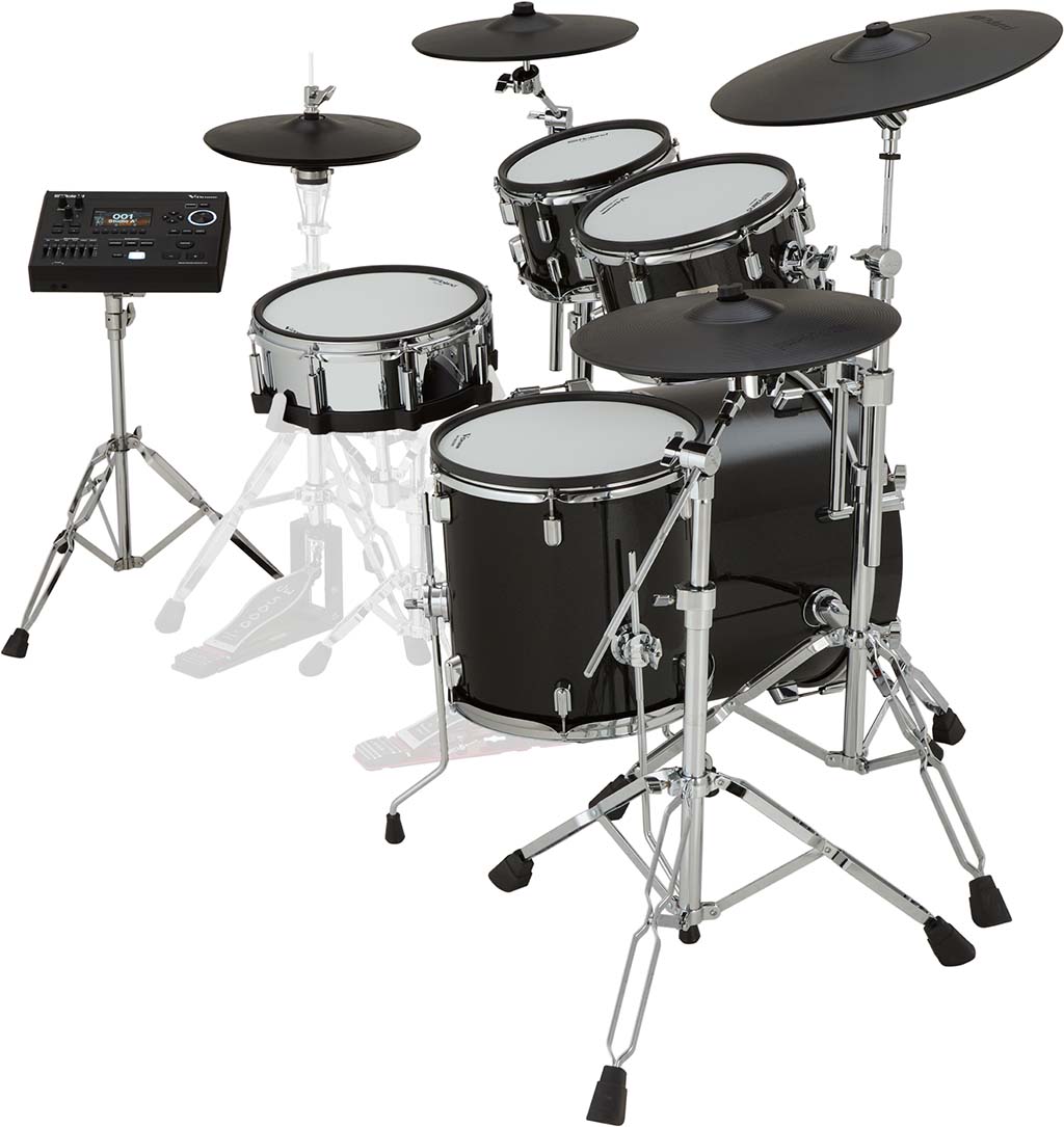 - Five-piece V-Drums Acoustic Design kit with shallow wood shells and a full-size kick.
