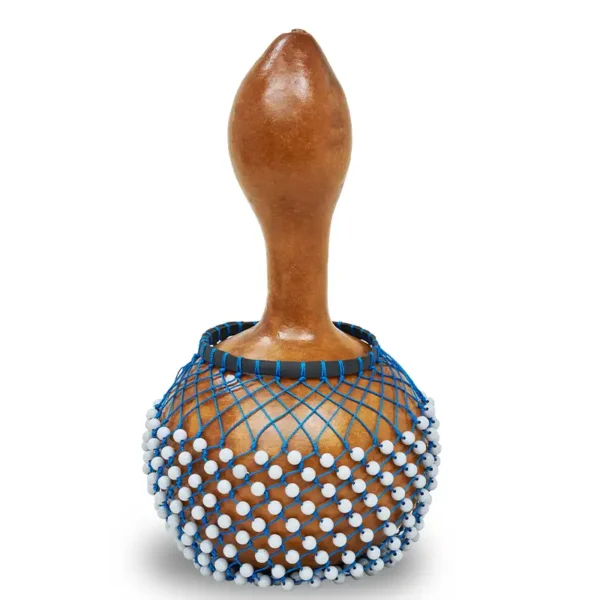 • hollow bottle gourd• net of powder blue plastic beads• sound range from soft murmurs, hissing waves and the roaring sea• energizes rhythms• traditio