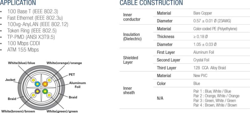 Complies with Category 6 UL444, ANSI/TIA/EIA 568B & ISO/IEC 11801 standard. Supports transmission of digital and analogue voice, data and video signal. Products adopts shielding Aluminum Foil + Crystal Foil + Al-Ma Alloy Braid, able to reach a very good shielding effect. Rated Temperature: -30° to +75°