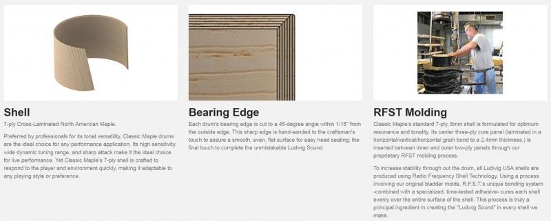 Classic Maple Series SONICALLY CAPTIVATING. VERSATILITY DEFINED. Classic Maple series drums have been the professional choice for over 20 years. Its full tonality, rich sustain, and exceptional versatility has made these drums the premier choice for any performance application. Utilizing a process refined through over a century of drum making, Classic Maple drums preserve the signature Ludwig sound with optimal performance. Select from a range of popular Standard Outfits or custom tailor your kit through The Ludwig Outfitter. Hand-crafted at Ludwig USA in Monroe, NC. Shell Classic Maple's standard 7-ply, 6mm shell is formulated for optimum resonance and tonality. Its center three-ply core panel (laminated in a horizontal/vertical/horizontal grain bond to a 2.4mm thickness,) is inserted between inner and outer two-ply panels through our proprietary RFST molding process. To increase stability through out the drum, all Ludwig USA shells are produced using Radio Frequency Shell Technology. Using a process involving our historic bladder molds that date back to the late 1960's, R.F.S.T.'s unique bonding system -combined with a specialized, time-tested adhesive- cures each shell evenly over the entire surface of the shell. This process is truly a principal ingredient in creating the "Ludwig Sound" in every shell we make. Bearing Edge Each drum's bearing edge is cut to a 45-degree angle within 1/16" from the outside edge. This profile is critical for a wide tuning range, and maximum sustain. The edge is hand-sanded to the craftsman's touch to assure a smooth, even, flat surface for easy head seating; the final touch to complete the unmistakable Ludwig Sound. Sonic Grid Bright attack with maximum sustain for exceptional adaptability. Classic Maple is ideal for any performance setting. Its versatility makes it the best "all-purpose" drum set for today's professional settings.