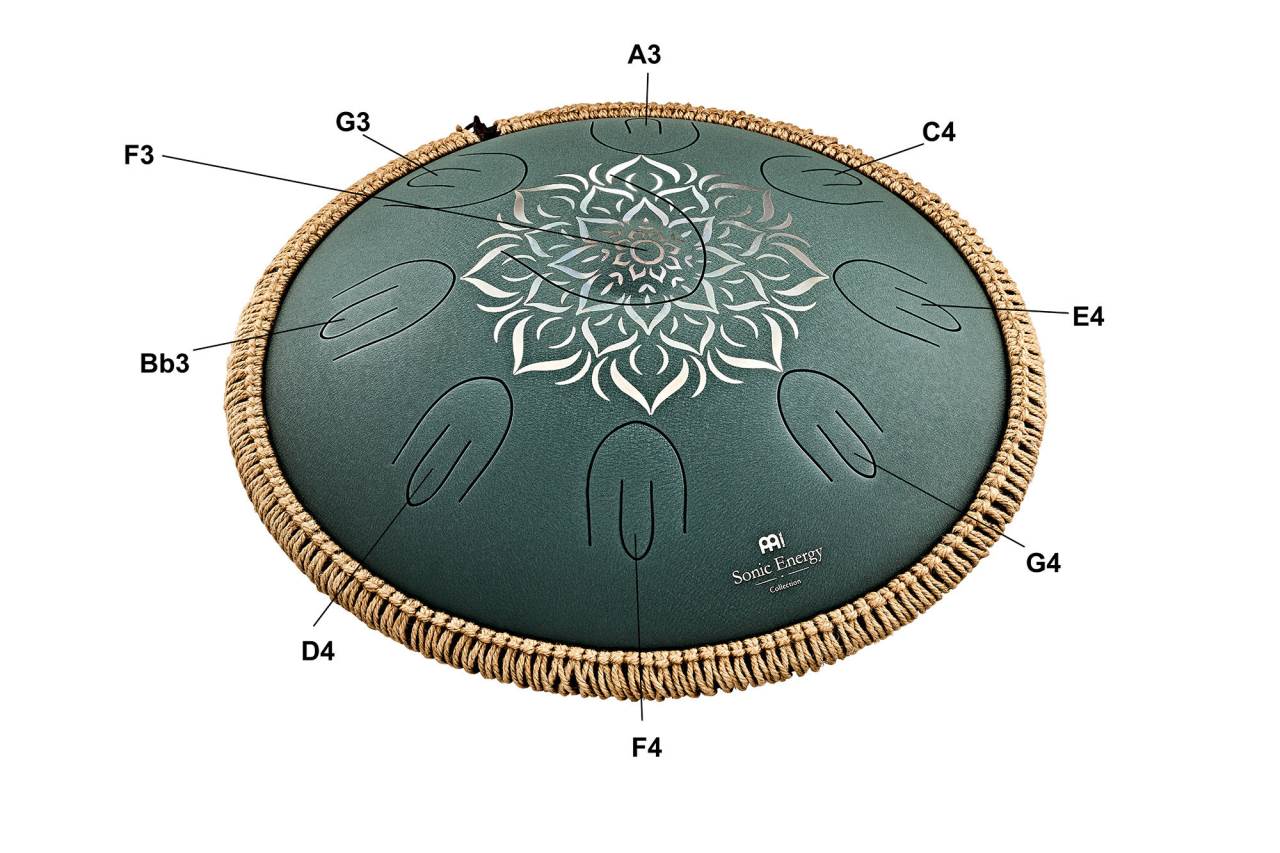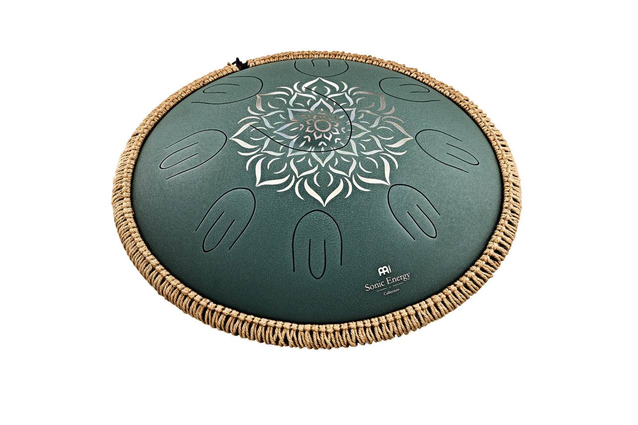 OSTD3DGE. Meinl Sonic Energy Octave Steel Tongue Drum, F Major, Dark Green, Engraved floral design. Meinl Sonic Energy Octave Steel Tongue Dru