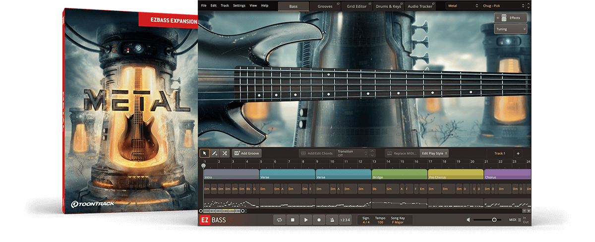 The Metal EBX is an expansion for EZbass designed to provide a broad palette of tones for metal. Combining detail, clarity and extreme power in the form of a pristinely defined low end, this instrument checks off all the characteristics needed to cut through just as well a brutal death metal track at break-neck speed as a rhythmic progressive passage, a dense wall of guitars or literally anything in between or beyond. Being bright and articulate at the same time as it’s dark and menacing, this is the definition of a great allround bass for heavy music.
