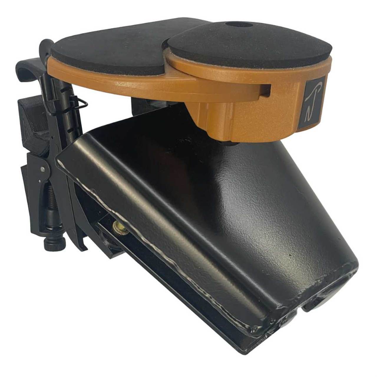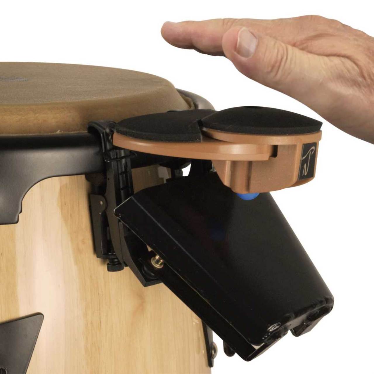 Paired with the patented RhymClips (“rim-klips”) universal mounting system, the RhymBlock can quickly mount on and off the hoop of a snare, tom, timbale, or various hoop-style hand drums. This adjustable mount allows you to place the RhymBlock in any unobstructed position around the drum, with customizable height at or above the hoop to suit your playing style.
