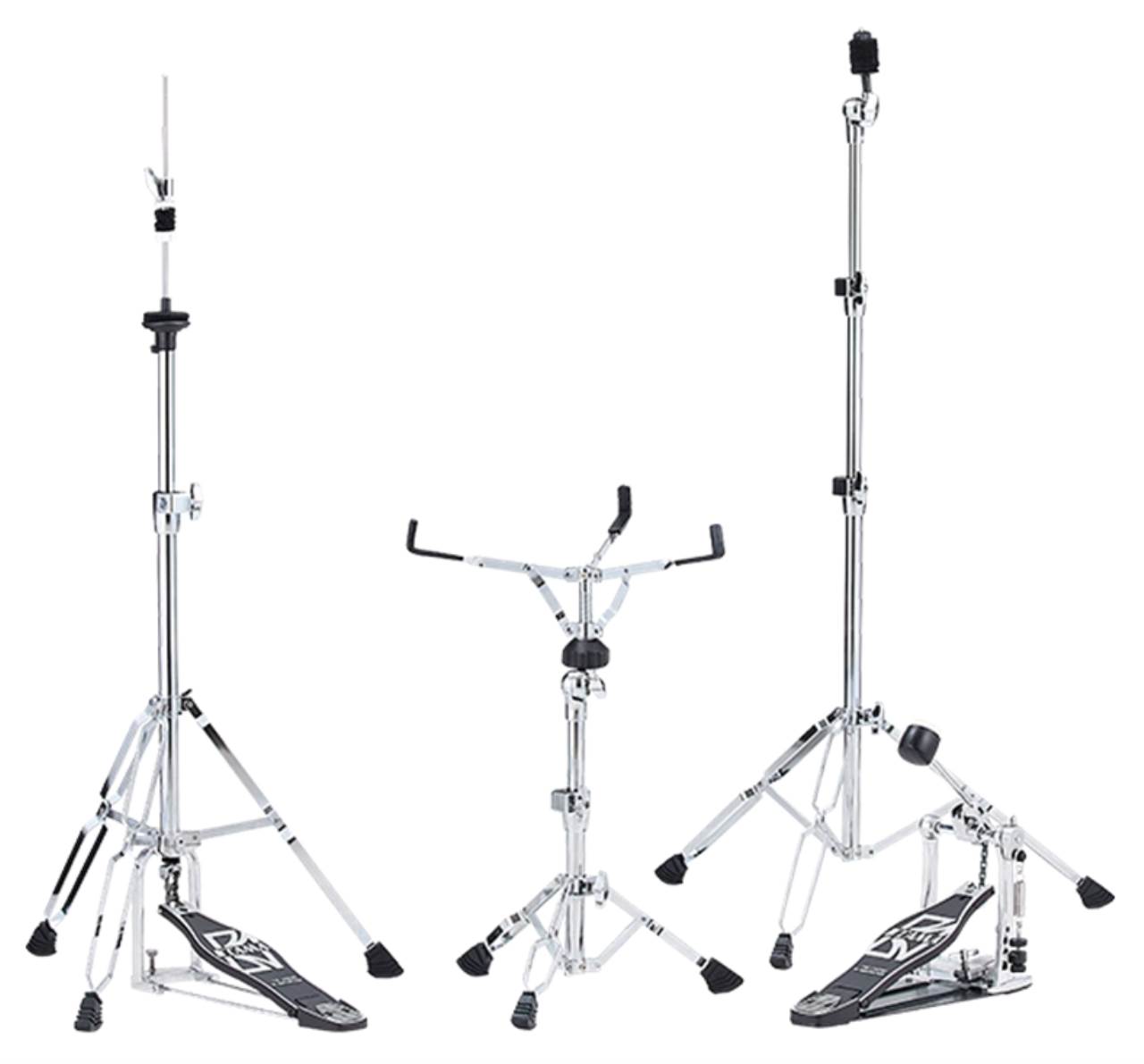 4-Delars Stativpaket inklusive: 1 x Rakt cymbalstativ HC03W, 1 x virvelstativ HS03W, 1 x Hi-hatstativ HH03W, alla med dubbelstagade ben samt en Bastrumpedal HP30P med stabiliserande fotplatta.