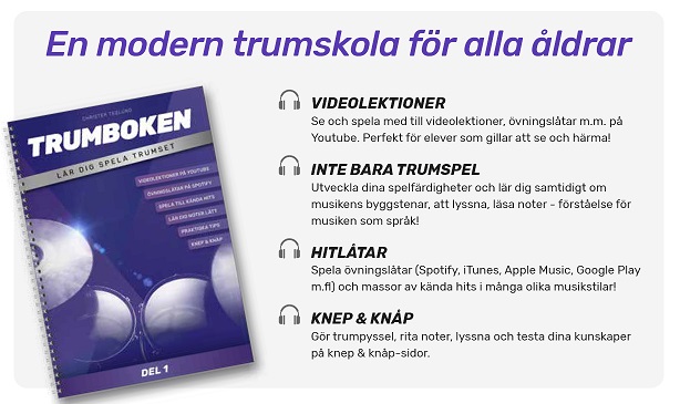 Trumboken är en lättförståelig trumkurs i kombinerad bok/videoform, med tydlig progression från nybörjare till avancerad nivå.